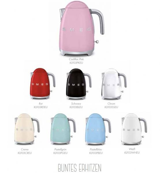 Wählen Sie Ihren SMEG Wasserkocher mit fester Temperatur (100° Celsius) aus einer Vielfalt an Farben aus: von sanften Farbtönen wie Creme, Pastellgrün und Pastellblau sowie Cadillac Pink zu kräftigem Schwarz über leuchtendem Rot bis hin zu glänzendem Chrom.